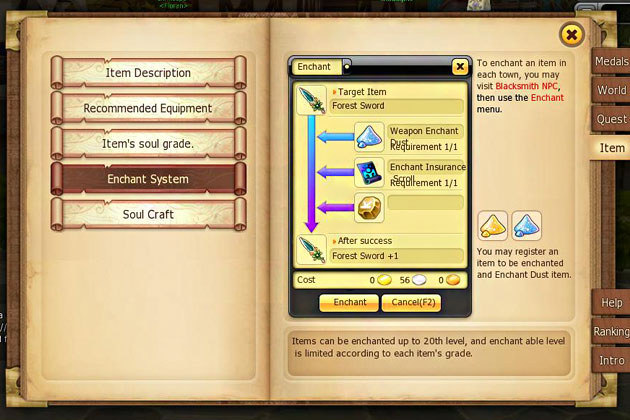 Enchanting increases an item's base stats. When an item has been successfully enchanted, the item's name will change. For example, a Bronze Sword that has been successfully enchanted once from its base state will be displayed at Bronze Sword+1. An item can be enchanted up to a maximum of 15 times, but is limited on its weapon level. The higher level of Enchantment attempted, the harder it will be to succeed.